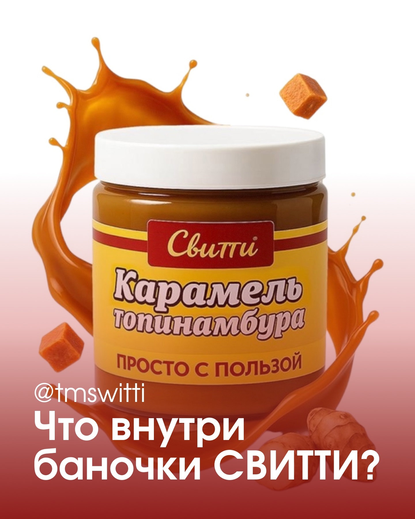 Карамель СВИТТИ изготовлена из сиропа топинамбура, крахмальной патоки, сухого молока, кокосового масла и щепотки соли. Всё это создаёт удивительно сбалансированный вкус — с лёгкими солёными нотками и насыщенной сладостью.